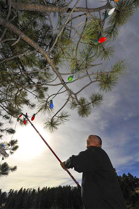 Holiday celebrant ( neighbor and friend ) hanging his Christmas lights on a late November day in Evergreen,CO.